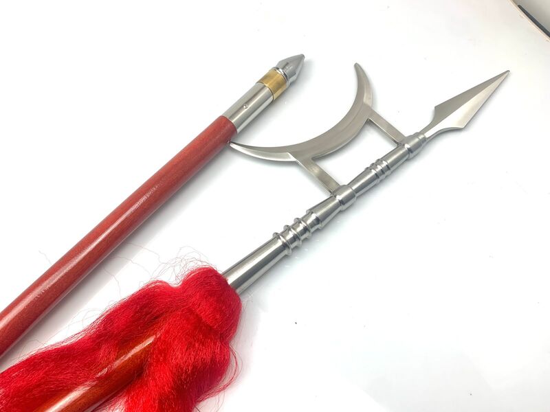 - Diseño: Cuenta con una hoja principal afilada y una hoja secundaria en forma de media luna, típica de las alabardas chinas.