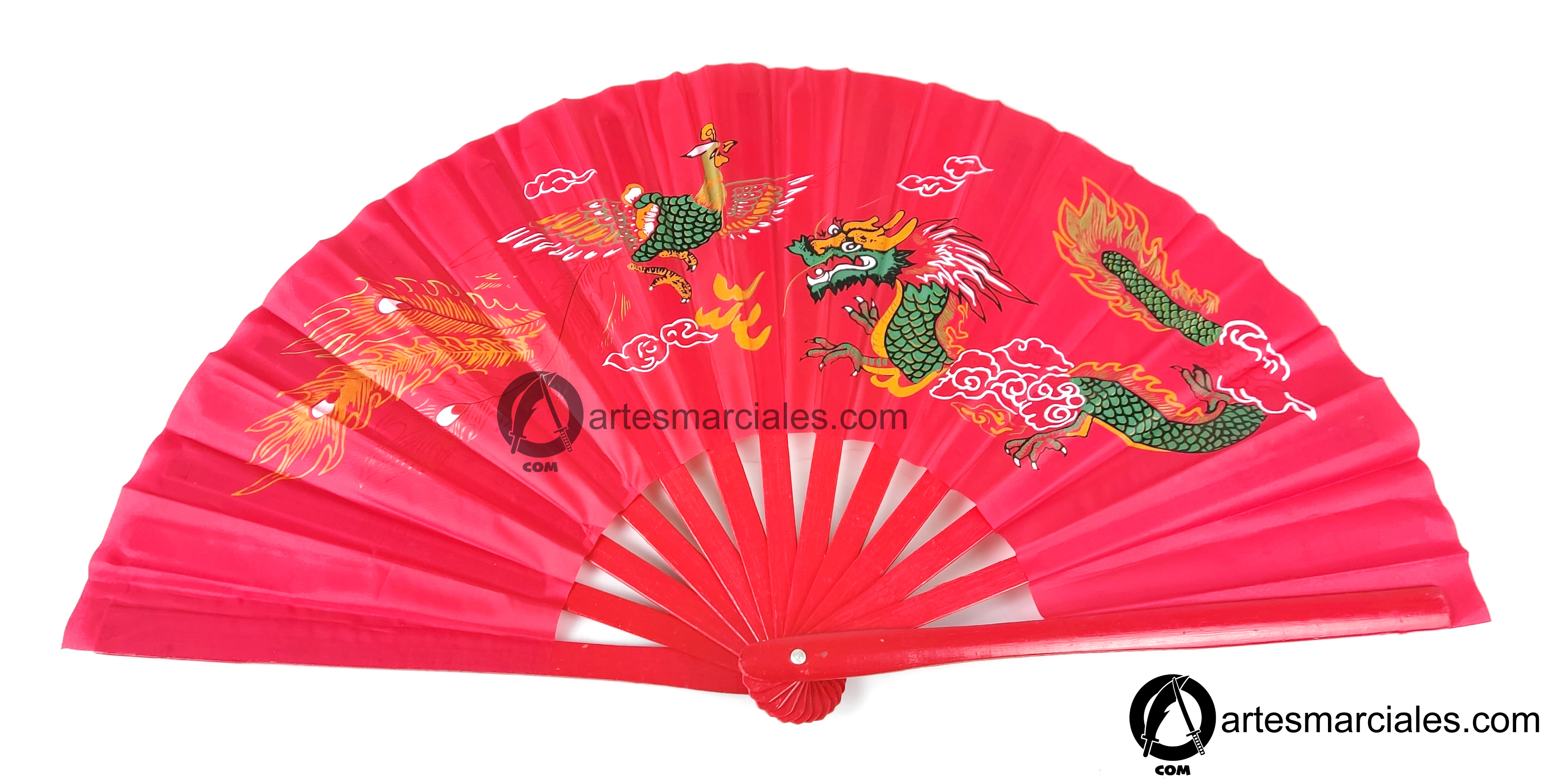 Abanico de Bambú original hecho a mano en China para la práctica de Tai Chi y de excelente calidad.En un vistoso color rojo y complementado con un fénix y un dragón, representaciones del Yin Yang.