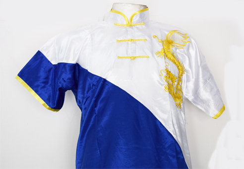 UNIFORME DE CHAN CHUAN BLANCO/ AZUL DE POLI SEDA, TALLAS CH, MED Y GDE.
